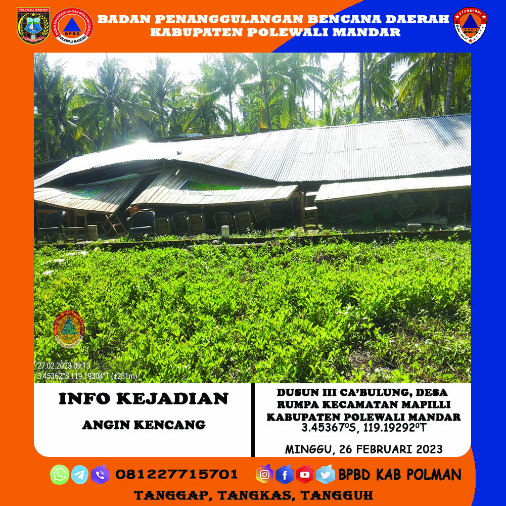 HALO #SahabattangguhLAPORAN BPBD (TRC - PB) KAB.POLMAN ijin melaporkan data kejadian bencana via WhatsappDilaporkan dengan hormat kejadian bencana di Kab. Polewali Mandar Provinsi Sulawesi BaratPetugas lapangan Tim Reaksi Cepat / TRC PB : 1. Ahmad SyarifSumber Informasi Dilapangan : 1. Kepala Desa Rumpa2. Babinsa Hamsa3. Kepala Dusun AliKEJADIAN BENCANAJenis Bencana : Angin KencangTanggal Kejadian : 26-02-2023Waktu Kejadian : 15.00 WITA LOKASI BENCANA Kecamatan : Mapil...