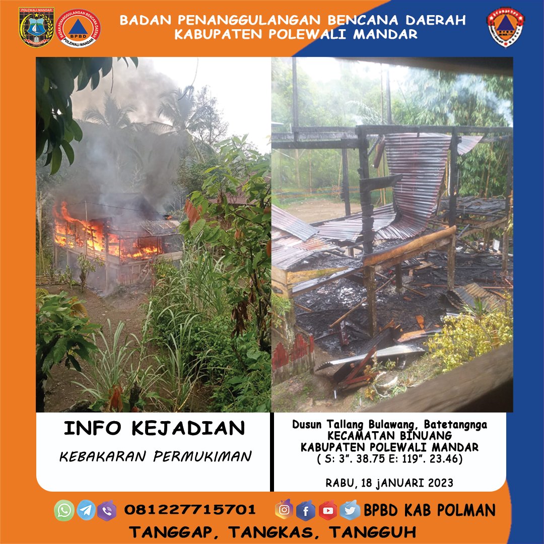 LAPORAN BPBD (TRC - PB) KAB.POLMAN ijin melaporkan data kejadian bencana via Whatsap Petugas lapangan : 1. Abdul jalil ( TRC) 2. Firham ( TRC) Sumber Informasi : 1. Kepala Dusun Tallang Bulawang JENIS KEJADIAN Jenis Bencana : KEBAKARANHari/Tanggal Kejadian : Rabu, 18-Januari-2023Waktu Kejadian : 12.00 WITA.Penyebab : Kompor Lupa dimatika LOKASI KEJADIAN Kecamatan : BinuangDesa/Kelurahan : B...