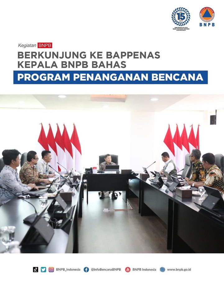Halo #SahabatTangguh Kepala BNPB Letjen TNI Suharyanto didampingi Deputi Bidang Penanganan Darurat BNPB Fajar Setyawan dan Plt. Kepala Pusat Data Informasi dan Komunikasi Kebencanaan BNPB Abdul Muhari, berdiskusi dengan Kepala Bappenas beserta jajaran di Kantor Bappenas di Jakarta, pada Selasa (24/1).#BNPBIndonesia #SiapUntukSelamat #BudayaSadarBencanaSemua tanggapan:107Bpbd Kepulauan Anambas, Pusdalops Bpbd Luwu Timur dan 105 lainnya...