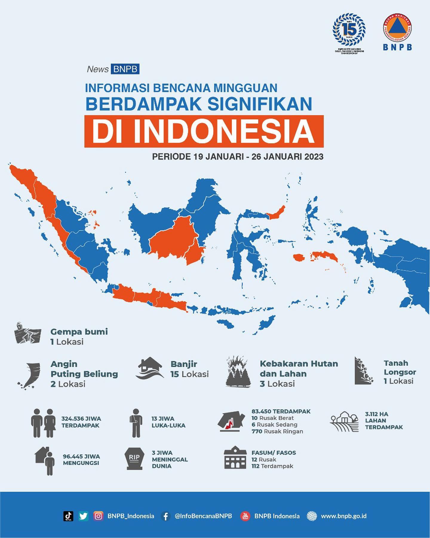 Halo #SahabatTangguh Berikut infografis bencana mingguan berdampak signifikan periode 19 -26 Januari 2023.Mari tingkatkan kapasitas dan kesiapsiagaan untuk Indonesia yang tangguh bencana!#BNPBIndonesia #SiapUntukSelamat #BudayaSadarBencana #InfografisBencanaMingguan...