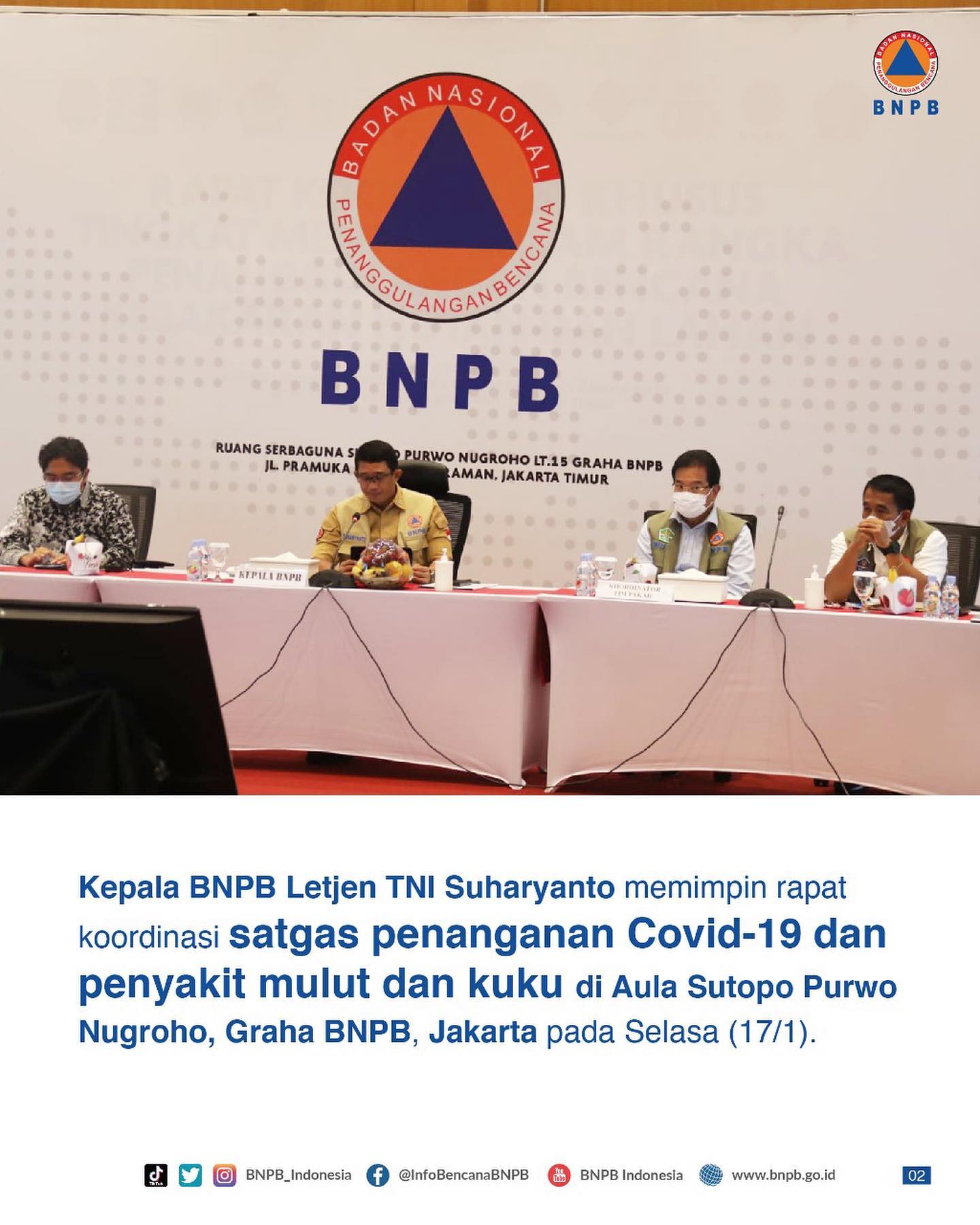 Kepala BNPB Letjen TNI Suharyanto memimpin rapat Koordinasi Satgas Penanganan Covid-19 dan Penyakit Mulut dan Kuku di Aula Sutopo Purwo Nugroho, Graha BNPB, Jakarta pada Selasa (17/1).