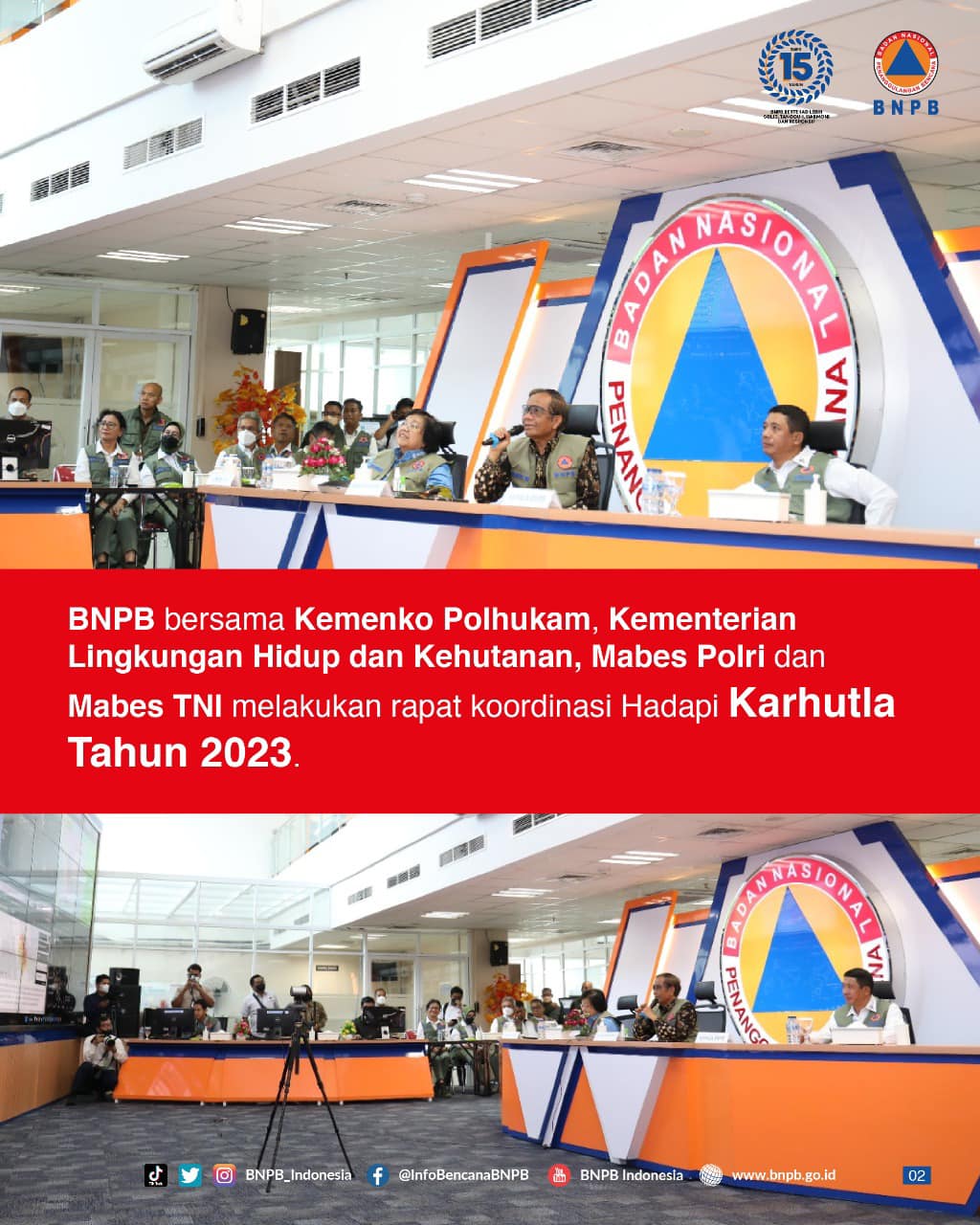 Dalam rangka antisipasi bencana kebakaran hutan dan lahan (Karhutla) pada periode tahun 2023, Badan Nasional Penanggulangan Bencana (BNPB) bersama Kementerian Bidang Politik Hukum dan Keamanan (Kemenko Polhukam), Kementerian Lingkungan Hidup dan Kehutanan (KLHK), Mabes Polri dan Mabes TNI melakukan rapat koordinasi di Graha BNPB, Jakarta, Rabu (25/1).
