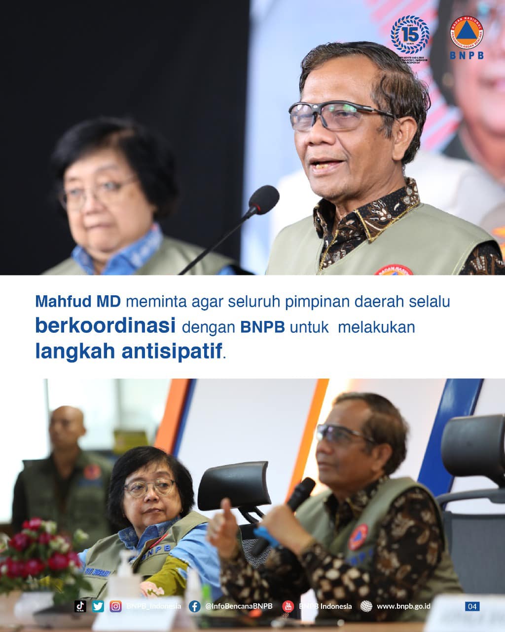 Dari hasil monitoring dua arah dari Graha BNPB dengan seluruh pimpinan daerah dan unsur forkopimda, Menko Polhukam mewanti-wanti agar segenap komponen yang ada di daerah selalu waspada. Mahfud MD meminta agar seluruh pimpinan daerah selalu berkoordinasi dengan BNPB untuk melakukan langkah antisipatif.